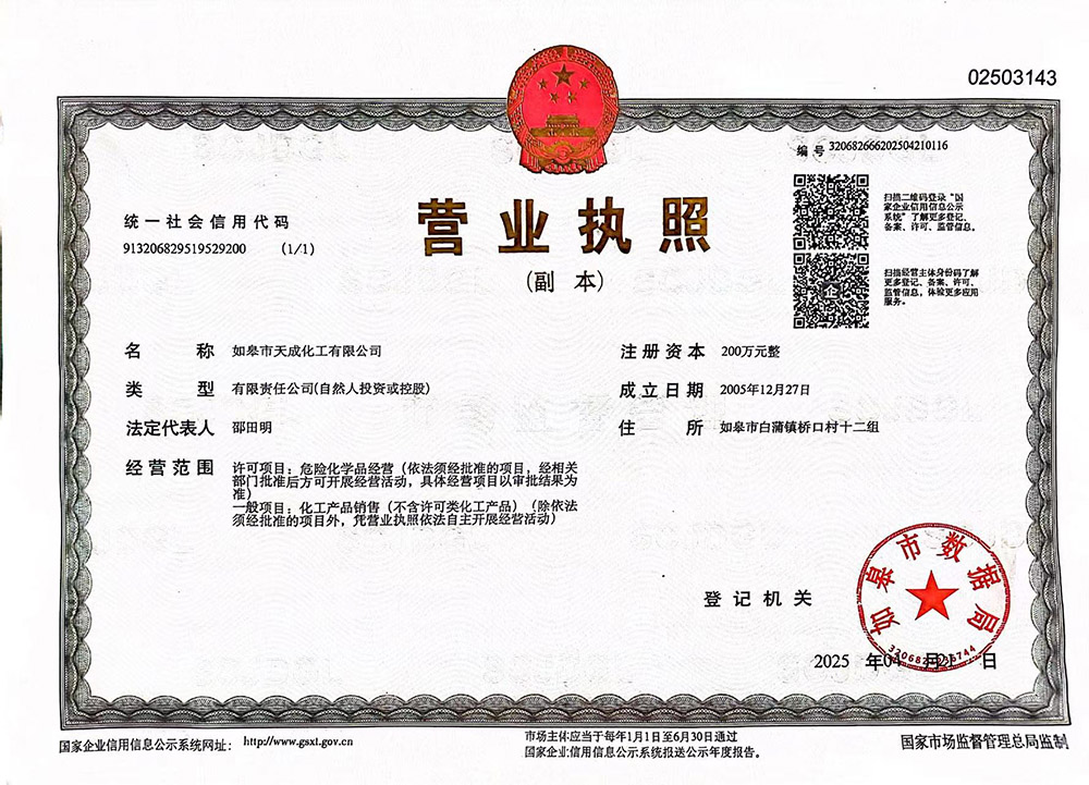 如皋市天成化工有限公司创建于1996年。公司地处于美丽富饶的长江三角洲,座落在古镇林梓,通扬运河河畔。南濒长江、西临204国道,距南通港、飞机场30公里,立体交通发达。公司经营管理规范,技术力量雄厚,拥有一批高、中级专业技术人才。